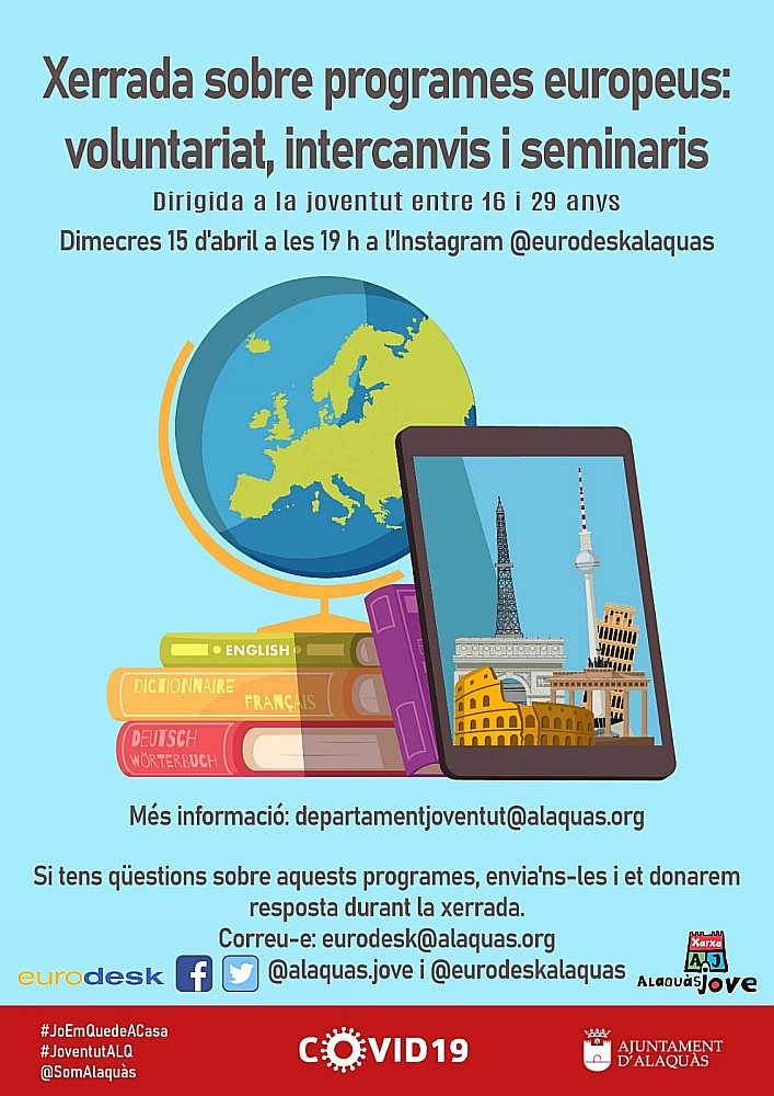 Xerrada sobre programes europeus 15-04-20 19:00 - 20:00 15 d’abril a les 19h tens una cita virtual a l’Instagram @eurodeskalaquas. Share the post "Xerrada sobre programes europeus" FacebookTwitterShare… Cursos Cursos Esdeveniments particulars Eventos particulares #alaquas #curso #europa #voluntariado